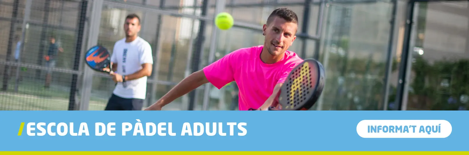 - Mini pàdel: nascuts/des entre el 2017 i el 2019 (de 6 a 8 anys). Etapa on treballem la iniciació i perfeccionament dels cops bàsics del pàdel, a més de les situacions de joc real, mitjançant jocs i activitats adaptades als diferents nivells.